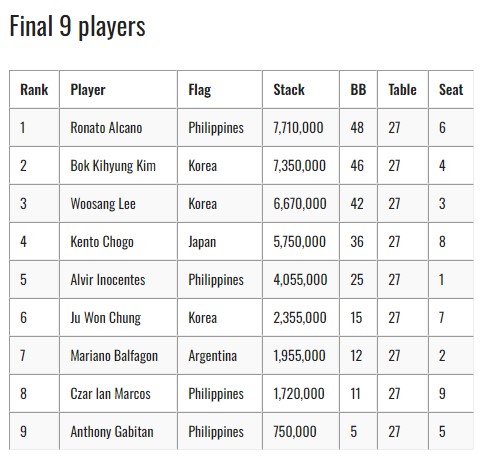 반대편에서는 라인업 중 네 명의 로컬 중 한 명인 Ronato Alcano가 있었다. Alcano는 꾸준한 페이스를 유지하며 한때 선두에 오르기도 했으며, 마지막 세 테이블에서 경쟁자들을 압도했다. Alcano는 10위에 오른 백영석을 포함한 여러 플레이어를 탈락시키며 하루를 마무리 지었다. 그는 48 bb의 칩 리드를 기록하며 첫 메인 이벤트 타이틀을 노리고 있다.