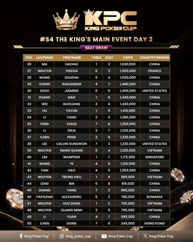 킹 포커 컵 메인 이벤트, 중국 천자이셴(Chen) 압도적 리드!