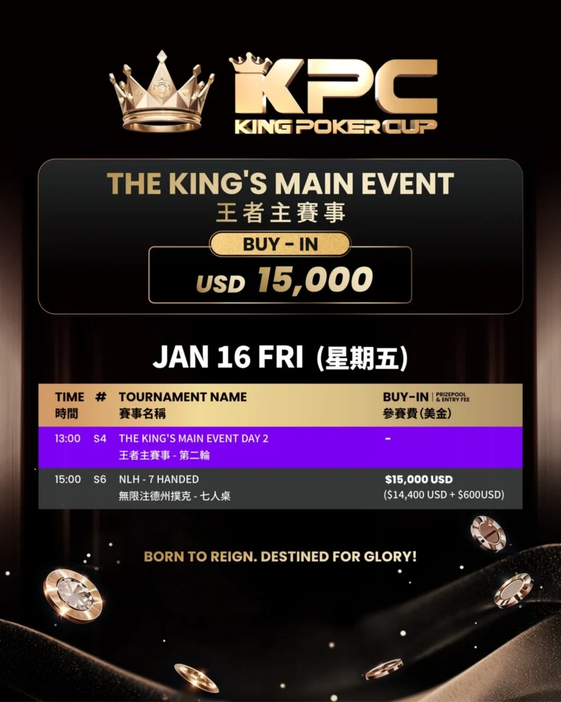 킹 포커 컵(King Poker Cup) 메인 이벤트 Day 1B가 2026년 1월 16일 제주 LES A 카지노에서 열렸다. USD 15,000 바이인으로 치러진 이 메인 이벤트에는 97명이 참가해 진검승부를 펼쳤다.