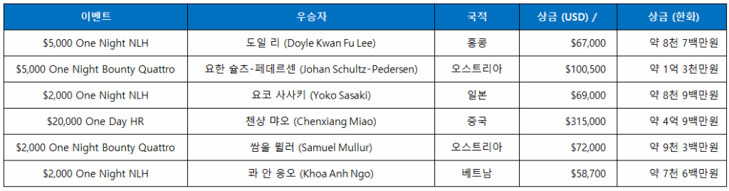 쥔 하오 우(Jun Hao Wu)는 리더보드를 주도하며 안정적인 칩 관리를 선보였고, 헤즈업에서는 야심 찬 블러프와 정확한 가치 베팅으로 상대를 압도, 극적인 우승을 완성했다.