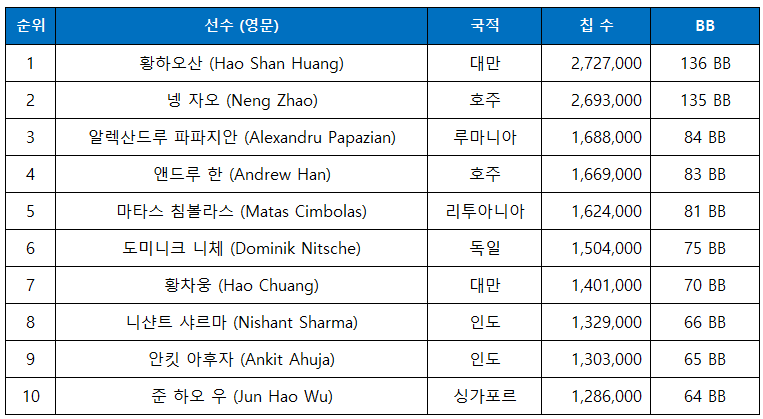 특히 2위 넹 자오, 3위 알렉산드루 파파지안, 5위 마타스 침볼라스, 6위 도미니크 니체 등은 국제 무대에서 이름값을 지닌 포커 강자들이다. 이들이 마지막 테이블에서 어떤 플레이를 펼칠지 기대된다.