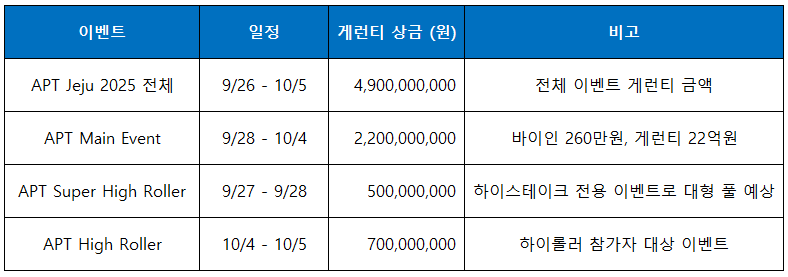 아시아 포커 투어가 2025년 9월 26일부터 10월 5일까지 제주 신화월드의 랜딩 카지노에서 APT Jeju 2025를 개최한다. 이번 페스티벌은 총 103개 이벤트로 구성되며 전체 게런티 상금은 약 49억원에 달해 아시아 토너먼트 중에서도 손꼽히는 규모를 자랑한다다. 대회는 103개 이벤트 스케줄을 갖춘 10일간의 페스티벌로 메인 이벤트 외에도 슈퍼 하이롤러, 하이롤러, 수퍼스타 챌린지, 조디악 클래식 등 다양한 하이라이트 이벤트로 구성된다. 메인 이벤트는 바이인 260만원, 게런티 22억원으로 대회 하이라이트가 될 예정이다.