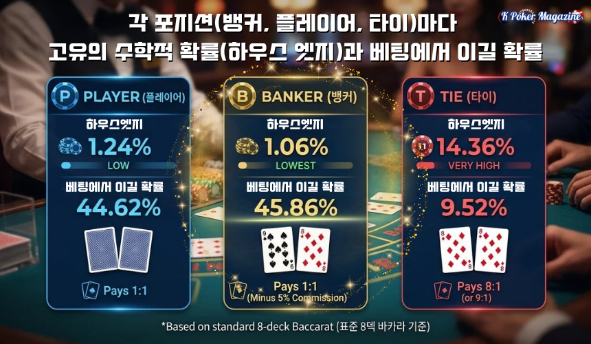 바카라는 기본적으로 홀짝 게임처럼 보이지만, 각 포지션(뱅커, 플레이어, 타이)마다 고유의 수학적 확률(하우스 엣지)이 존재한다. 성공적인 바카라 배팅 전략의 첫걸음은 이 미세한 확률의 차이를 완벽하게 이해하고, 카지노가 가진 유리함을 최소화하는 데서 출발한다. 테이블 위에서 발생하는 모든 결과는 독립 확률이지만, 전체적인 슈(Shoe)의 흐름 속에서 확률적 우위를 선점하는 포지션을 찾는 것이 핵심이다.