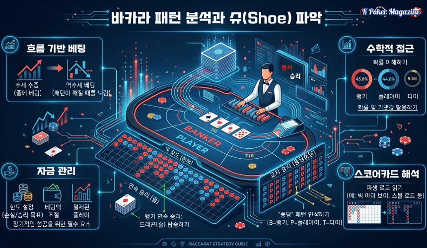 수학적 접근 다음으로 중요한 것은 바카라 패턴 분석이다. 카드의 배열인 ‘슈(Shoe)’는 매번 다르지만, 특정한 흐름을 띨 때가 많다. 한쪽이 연속해서 이기는 ‘줄’ 장세, 뱅커와 플레이어가 번갈아 나오는 ‘퐁당퐁당’ 장세 등 테이블의 트렌드를 빠르게 파악해야 한다.