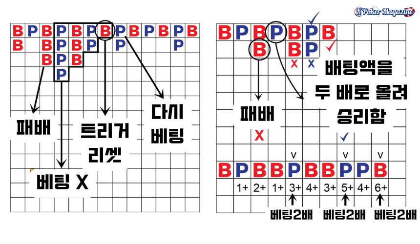 가장 대중적이고 효과적인 방법은 ‘마지막 승자를 따라가는 것’이다. 뱅커가 이겼다면 다음 판도 뱅커에 걸고, 플레이어가 이겼다면 플레이어에 거는 방식이다. 반대로 흐름이 계속 교차하는 퐁당 장세임을 확인했다면, 이전 승자의 반대 포지션에 베팅하는 역추세 매매를 시도해 볼 수 있다. 중요한 것은 본인의 예측이 틀렸을 때 무리하게 고집을 부리지 않고 즉각 베팅을 멈추며 흐름을 관망하는 태도다.