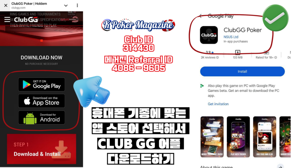 구글 플레이스토어(Android) 또는 애플 앱스토어(iOS)에서 ‘ClubGG Poker’를 검색하여 다운로드 및 설치합니다. (또는 www.clubgg.com 접속 후 다운로드)