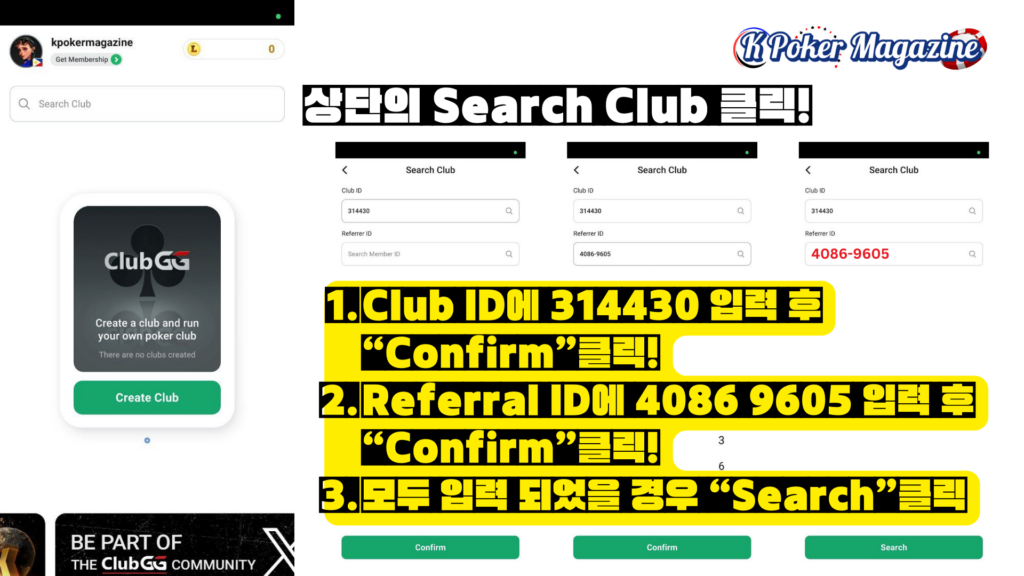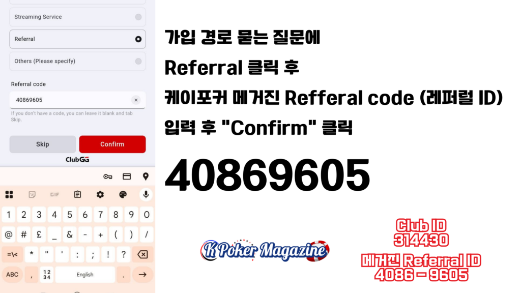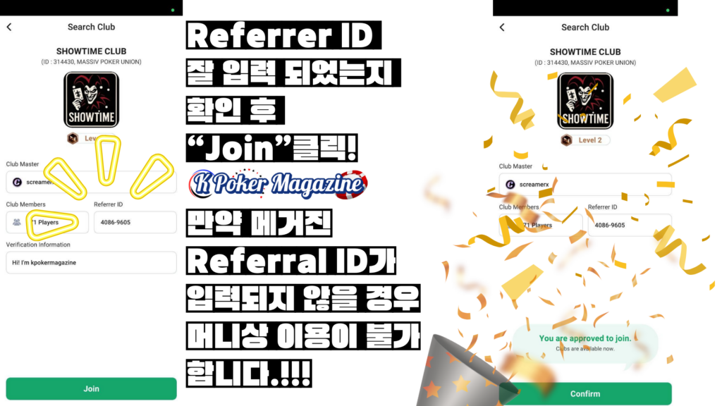 주의: 케이포커 매거진 레퍼럴 ID(4086 9605)로 클럽에 가입하지 않으신 분들은 해당 머니상 이용이 불가하오니 반드시 레퍼럴을 확인해 주세요.