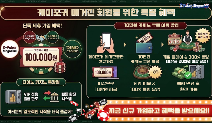 다이노 웹사이트와의 단독 제휴를 통해, 매거진을 통하여 가입하시는 모든 신규 회원님께 다이노 카지노에서 바로 사용 가능한 10만 원 상당의 카지노 쿠폰을 100% 즉시 지급합니다!