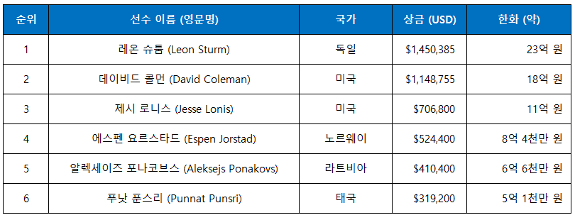 24세의 슈툼은 이번 우승으로 자신의 커리어 최고 상금을 경신하며, 포커계의 차세대 스타로 떠올랐다.