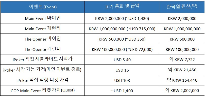 GOP의 메인 이벤트는 KRW 2,000,000(약 USD 1,430) 바이인과 KRW 1,000,000,000(약 USD 715,000) 개런티라는 파격적 스펙으로 설계되어 있어 아시아 라이브 포커 신(scene)의 대형 행사로 자리매김할 준비를 마쳤다. 또한 축제 기간에는 총 80개의 이벤트가 준비되어 있고 GOP 고유의 ‘Cronus Structure’가 적용된 혁신적인 경기형식을 선보일 예정이다.
