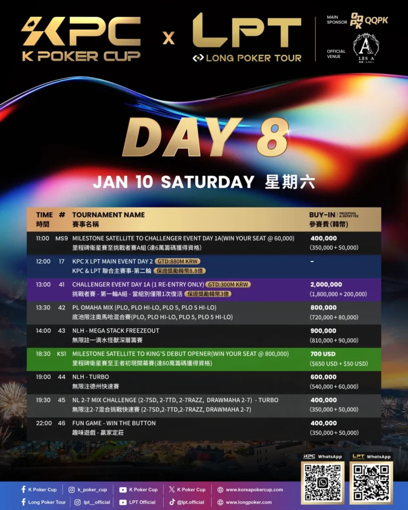 2026년 1월 초 제주도 LES A Casino에서 열린 KPC x LPT Series 2026 메인 이벤트가 참가자 사상 최고 기록을 세우며 전 세계 포커 팬들의 이목을 집중시켰다. 총 2,030명의 참가자가 등록을 마쳐 역대 K Poker Cup 시리즈 중 최대 규모의 필드를 형성했다. 이 기록은 올해 포커 축제의 하이라이트로 남을 역사적인 순간이다.