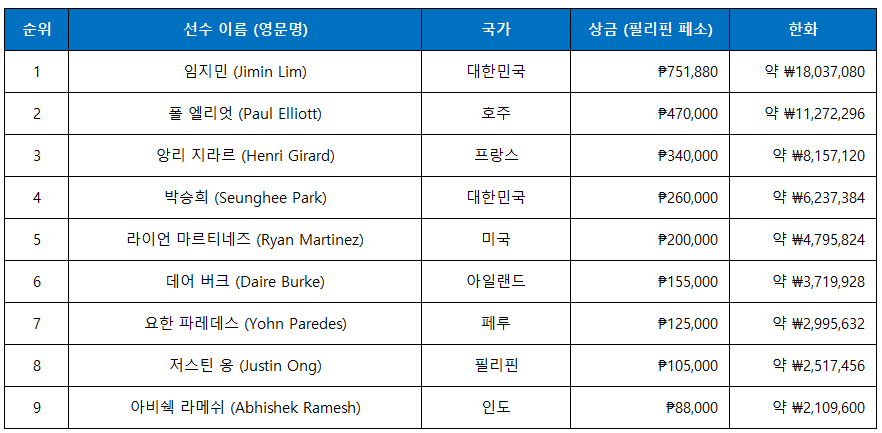 Manila Megastack 23 Mystery Bounty 파이널 테이블에는 폴 엘리엇(Paul Elliott), 앙리 지라르(Henri Girard), 데어 버크(Daire Burke) 등 국제 무대에서 이름을 알린 선수들이 포진해 대회의 수준을 높였다. 이들 선수는 토너먼트 경험과 기술적 깊이를 보여주며 경기 내내 팽팽한 기량 대결을 펼쳤다. 그 가운데 대한민국의 임지민 선수가 대담한 바운티 사냥과 냉정한 결정력으로 정상에 서는 장면은 많은 이들의 주목을 끌었다.