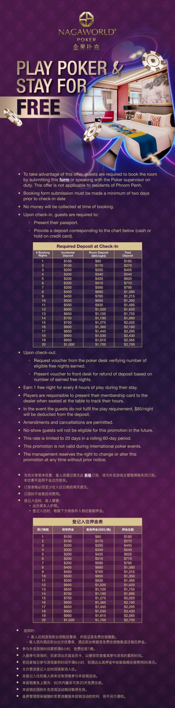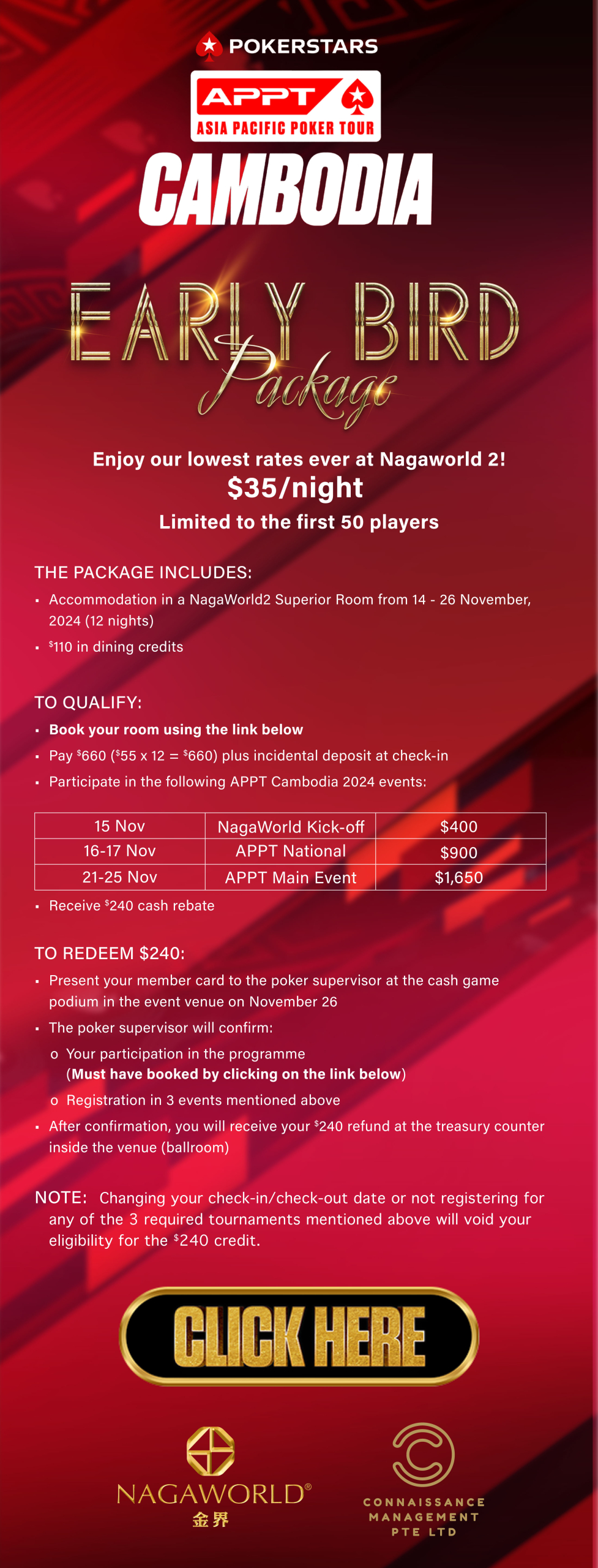 토너먼트 중심의 혜택 외에도, NagaWorld는 APPT 기간 동안 모든 예약에 대해 1박에 최저 55달러의 요금으로 문을 연다. 최소 3박 이상 예약해야 할인 요금을 받을 수 있으며, 더 오래 머무를수록 더 많은 무료 다이닝 크레딧이 제공된다.