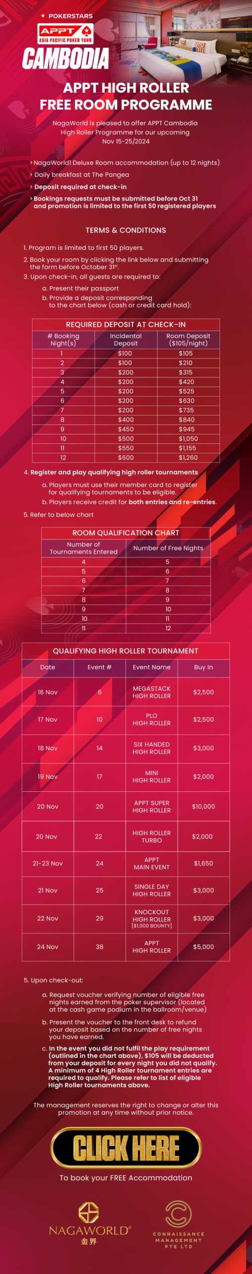 하이롤러들은 10월 31일까지 첫 50명의 등록자에게 제공되는 제한된 프로모션을 이용할 수 있다. APPT 하이롤러 무료 객실 프로그램은 시리즈 기간 동안 참가한 하이롤러 토너먼트 수에 따라 NagaWorld1의 디럭스 룸에서 최대 12박 동안 숙박과 The Pangea에서의 조식을 제공한다. 체크아웃 시, 참가자들은 토너먼트 바우처를 제시하고 간편하게 보증금을 환불받을 수 있다. 해당 프로모션을 받으려면 최소 4개의 하이롤러 엔트리가 필요하다.