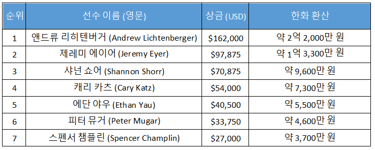 대회의 최종 승자는 앤드류 리히텐버거(Andrew Lichtenberger)였다. 온라인과 라이브 무대를 넘나드는 세계 정상급 포커 프로인 리히텐버거는 이번 우승으로 개인 통산 8번째 PGT 타이틀을 기록했다. 이는 PokerGO Tour 역사상 손꼽히는 기록으로, 리히텐버거가 여전히 최정상급 경쟁력을 유지하고 있음을 입증하는 성과다.