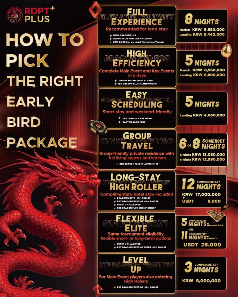 RDPT PLUS 제주 2026의 우승자는 단순한 상금을 넘어 포커 플레이어로서 최고의 명예를 얻게 된다. RDPT의 상징인 ‘레드 드래곤 챔피언 재킷’이 다시 돌아왔다. 이 재킷은 오직 선택받은 챔피언만이 입을 수 있는 승리의 상징이다. 또한, 주요 4개 이벤트(프레스티지 하이롤러, 메인 챔피언십, 슈퍼 U 챌린지, 프레스티지 슈퍼 하이롤러) 우승자에게는 화려한 브레이슬릿과 47cm 높이의 웅장한 레드 드래곤 트로피가 수여된다.
