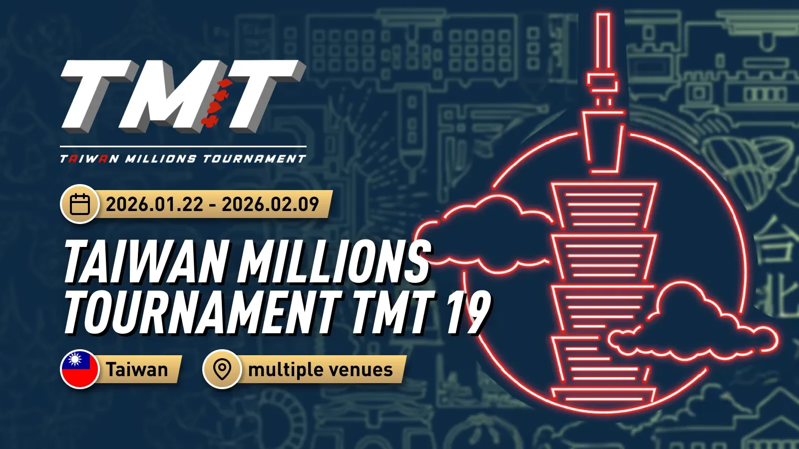 Taiwan Millions Tournament 19 (TMT 19)는 2026년 1월 22일부터 2월 9일까지 대만 타이페이에서 개최되며 아시아 포커 신기록을 세웠다. 총 30,788명 참가, 130개 이상의 트로피 수여, 총 상금 USD 5.7M 이상(약 77억 원)을 기록하며 명실상부한 아시아 최대 규모 시리즈로 자리매김했다.