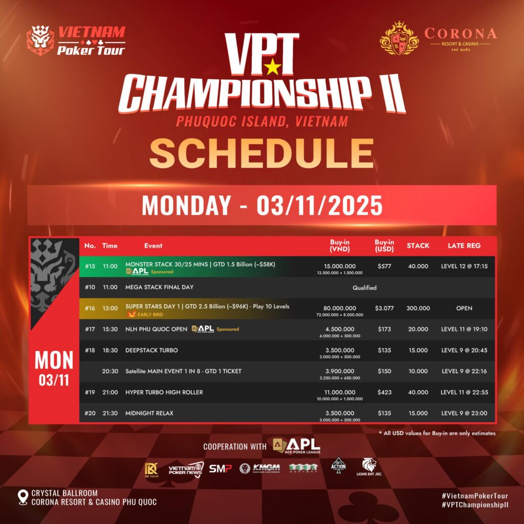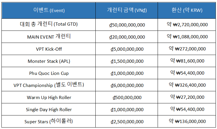 VPT Championship II는 VN₫50억(약 ₩27.2억)에 달하는 거대한 개런티 금으로 아시아 라이브 포커 축제를 한층 업그레이드했으며, 메인 이벤트와 다수의 하이롤러·스페셜 이벤트가 혼재해 현장성과 볼거리를 모두 잡은 페스티벌이다. 한국 선수와 팬들에게도 접근성이 좋아 눈여겨볼 가치가 충분하다.