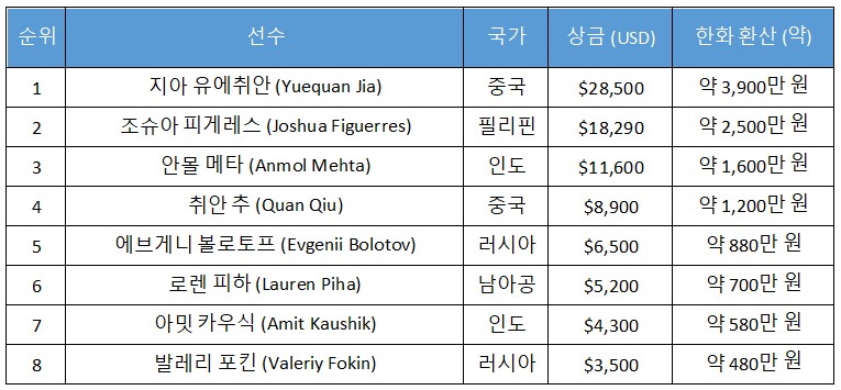 그 결과 지아 선수는 우승 상금 $28,500(약 3,900만 원)과 여러 바운티 보상, 그리고 향후 WPT Prime Championship $1,100 시드를 획득했다.