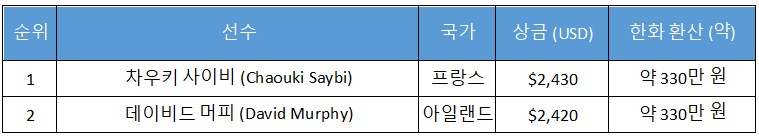 또 다른 Deepstack 20/15/10 이벤트 ($550)에서는 프랑스 선수 차우키 사이비(Chaouki Saybi)가 아일랜드의 데이비드 머피(David Murphy)를 상대로 극적인 승리를 기록했다. 차우키는 베테랑 머피의 경험을 상대로 간발의 차로 승리했다.