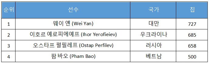 대만의 웨이 옌(Wei Yan)이 최대 스택 727,000을 기록하며 데이1A에서 리더로 마감했다.